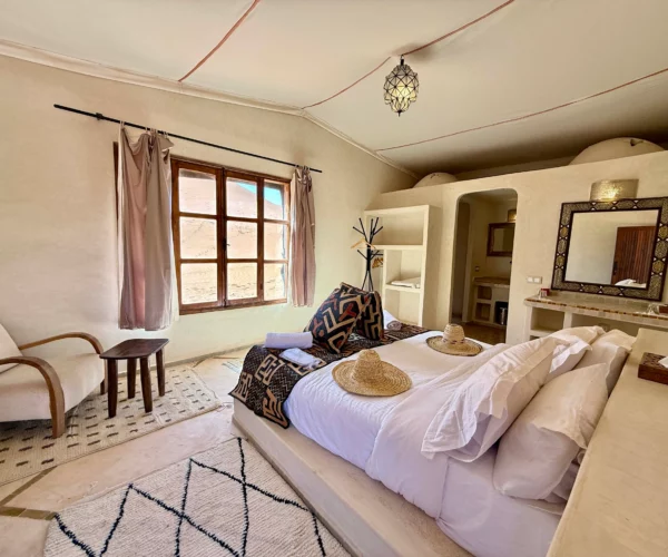 You will meet nomads, share mint tea, and visit a sacred oasis hidden in the sand. Afterward, we drive off-road across dunes and dry plains until we reach our Erg Chigaga luxury camp.